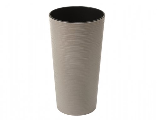 Vysoký plastový obal na črepník s vnútornou vložkou má unikátny vzhľad pripomínajúci prútie. Je vhodný do interiéru aj vonkajších priestorov, je odolný voči UV žiareniu. Obal je vyrobený z recyklovaného plastu s obsahom až 40% drevených štiepok. Farba: šedá. Priemer: 25 cm, výška: 47 cm.