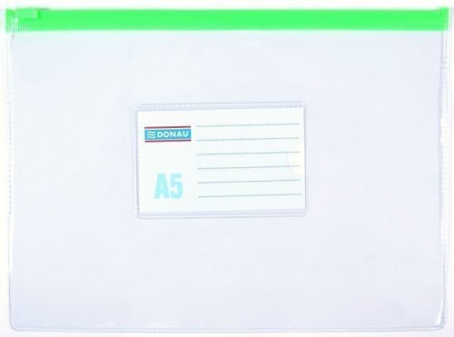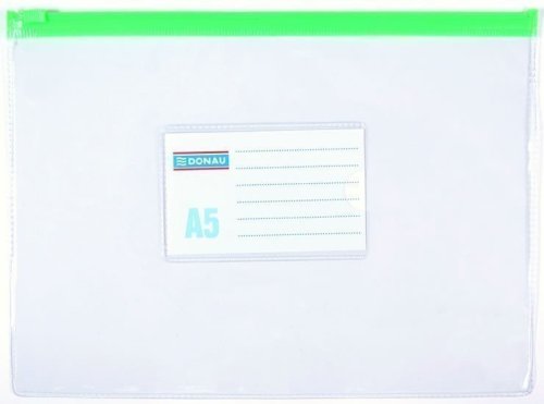 Obálka formátu A5 s plastovým zipsom vhodná na organizáciu a ochranu drobných dokladov. Transparentný pevný obal s odolného PVC (170 µm). Farebný plastový zips umiestnený na dlhšej strane. Praktický vymeniteľný štítok na vonkajšej strane. Rozmer: 180x240 mm.