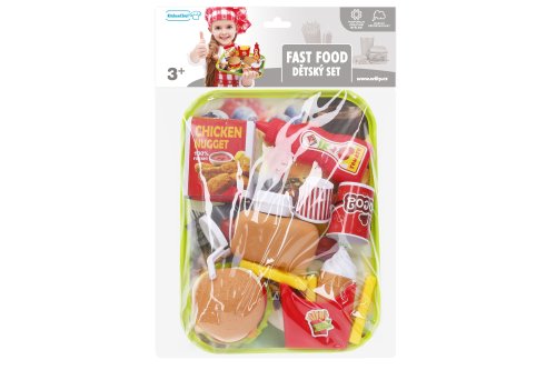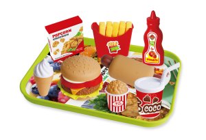 Občerstvenie Fast Food s táckou. Súčasťou tácka, hamburger, hranolky, párok v rožku, zmrzlina, nápoj, kečup, kuracie nugety, vidlička, nôž.