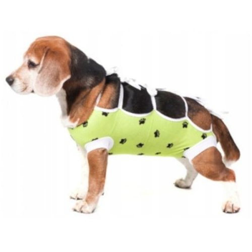 Pooperačný obleček je textilný výrobok určený pre psy stredne veľkých plemien, ako sú napr. bígl, kokeršpaniel alebo baset. Jeho úlohou je komfortná ochrana hrudníka a brucha pred znečistením a olizovaním. Používa sa po chirurgickom zákroku, v dermatologickej praxi a pod. Chráni pred pooperačnými komplikáciami (infekcia rany, olizovanie rany a následné predčasné odstránenie stehov). Obleček na opakované použitie je ušitý z prvotriednej vzdušnej hypoalergénnej látky, fixačné pásky a manžety sú z čistej bavlny. Použitý dizajn uľahčuje obliekanie zvieraťa a neobmedzuje ho pri fyziologických potrebách. Obleček má výrez na penis, aby sa pes mohol vyvenčiť. Po venčení je možné výrez prekryť klapkou opatrenou šnúrkami. Oblek aj manžety sú z pružného materiálu, fixačné pásky sa zaväzujú na chrbte zvieraťa. Pre určenie správnej veľkosti oblečku je dôležitá vzdialenosť medzi prednými a zadnými končatinami. Výška ani šírka trupu nie je podstatná. Ak je miera hraničná, odporúčame pre väčší komfort zvieraťa zvoliť väčšiu veľkosť. Veľkosť: L Dĺžka (cca): 44 cm Údržba: Možno použiť opakovane po dôkladnej parnej sterilizácii alebo vypraní na 90 °C. Farba a vzor: Fotografia je iba ilustračná. Ide o mix variantov. Farbu a vzor zasielame podľa aktuálnej skladovej zásoby.