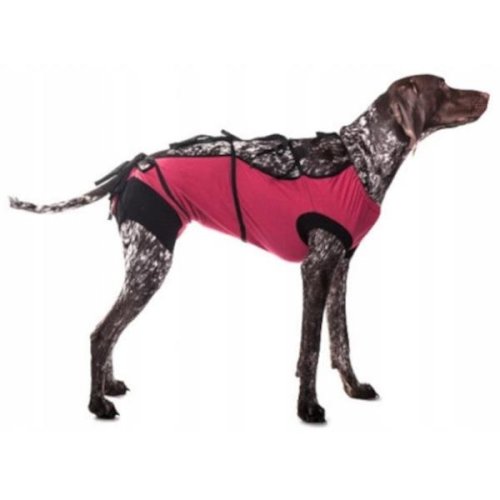 Pooperačný obleček je textilný výrobok určený pre psy stredne veľkých plemien, ako sú napr. stavači, zlatý retriever, doberman alebo boxer. Jeho úlohou je komfortná ochrana hrudníka a brucha pred znečistením a olizovaním. Používa sa po chirurgickom zákroku, v dermatologickej praxi a pod. Chráni pred pooperačnými komplikáciami (infekcia rany, olizovanie rany a následné predčasné odstránenie stehov). Obleček na opakované použitie je ušitý z prvotriednej vzdušnej hypoalergénnej látky, fixačné pásky a manžety sú z čistej bavlny. Použitý dizajn uľahčuje obliekanie zvieraťa a neobmedzuje ho pri fyziologických potrebách. Obleček má výrez na penis, aby sa pes mohol vyvenčiť. Po venčení je možné výrez prekryť klapkou opatrenou šnúrkami. Oblek aj manžety sú z pružného materiálu, fixačné pásky sa zaväzujú na chrbte zvieraťa. Pre určenie správnej veľkosti oblečku je dôležitá vzdialenosť medzi prednými a zadnými končatinami. Výška ani šírka trupu nie je podstatná. Ak je miera hraničná, odporúčame pre väčší komfort zvieraťa zvoliť väčšiu veľkosť. Veľkosť: XL Dĺžka (cca): 51 cm Údržba: Možno použiť opakovane po dôkladnej parnej sterilizácii alebo vypraní na 90 °C. Farba a vzor: Fotografia je iba ilustračná. Ide o mix variantov. Farbu a vzor zasielame podľa aktuálnej skladovej zásoby.