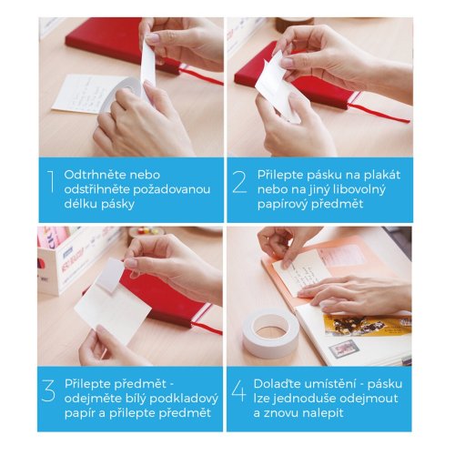 Silne lepiaca obojstranná samolepiaca páska s možnosťou opakovaného použitia. Vhodná na plagáty, fotografie, aranžovania a pod.