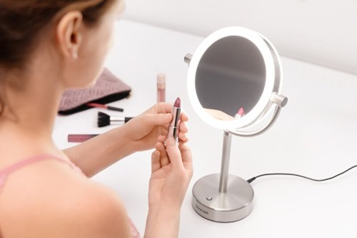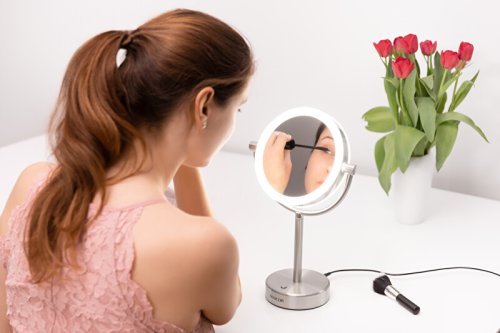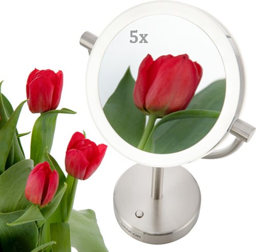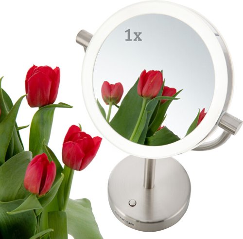 Kozmetické zrkadlo Priemer 18 cm Obojstranné prevedenie Určené pre osobnú hygienu žien, mužov i dospievajúcich mládeže Jedna strana poskytuje normálne zobrazenie druhá strana s päťnásobným zväčšením umožňuje dokonalú starostlivosť pre každý detail Podsvietenie LED diódami Úsporná prevádzka (spotreba max. 5 W) Zapnutie a vypnutie podsvietenia pomocou spínača osi Celonerezové prevedenie Napájanie zo siete Rozmery (šírka × hĺbka × výška): 220 × 120 ×360 mm Hmotnosť: 0,8 kg