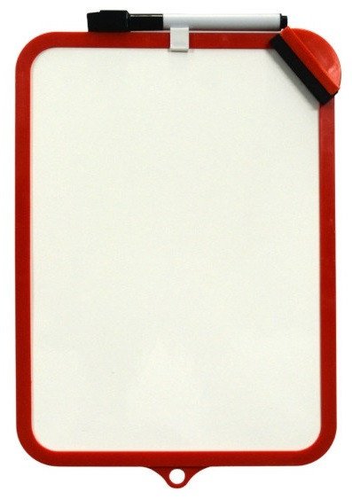 Obojstranne stierateľná tabuľka s rozmermi 19 x 29 cm s červeným rámčekom. Z jednej strany má potlač liniek a štvorčekov az druhej strany je hladká a čistá. kresbu pomocou hubky alebo handričky Sada obsahuje popisovač s hubkou a samostatnú hubku na stieranie Tabuľka je navyše vybavená očkom pre praktické zavesenie.