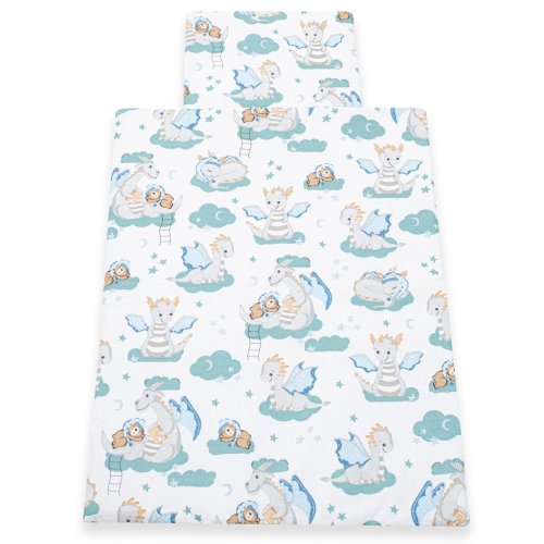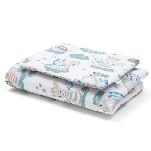 Nádherný obojstranný set New Baby Dráčik do kočíka. Set je vyrobený z dvoch typov tkanín. Bavlnený materiál s krásnym detským motívom z jednej strany a Velvet materiál z druhej strany. Velvet je veľmi príjemný a jemný na dotyk a po dlhú dobu si zachováva svoj pôvodný tvar. Je ideálny ako pre bábätká od narodenia, tak aj pre väčšie deti ako deka na hranie, do kočíka alebo na von. Set obsahuje vankúšik a prikrývku. Kladieme dôraz na kvalitu a preto je set z Velvet ušitý z veľmi kvalitného materiálu, ktorý nepúšťa farbu a nevyvoláva alergické reakcie. Set je jemný na dotyk, hrejivý, tulivý, jedinečný a veľmi odlišný od ostatných. Všetko je vyplnené antialergickým vláknom. Zloženie: z jednej strany 100% bavlna potlačená krásnym detským vzorom, druhá strana je Velvet látka-100% polyester, výplň 100% antialergické vlákno. Materiál zodpovedá norme Oeko-Tex Standard 100. Rozmery: vankúšik: cca 30x25 cm, prikrývka: cca 75x50 cm. Tieto výrobky sú bezpečné, pretože:<BR>- prírodná bavlna nespôsobuje odreniny a podráždenie, pretože neobsahuje formaldehydy a ďalšie prvky, ktoré dojčatám škodia<BR>- nestráca farbu a nezafarbuje oblečenie<BR>- ponúkané vzory sú príjemné na pohľad a majú upokojujúce farby<BR>- nie sú použité žiadne gombíky ani žiadne ďalšie plastové alebo oceľové časti, ktoré môžu byť pre Vaše dieťa nebezpečné<BR>- materiál, ktorý je používaný pre výplne vankúšov a prikrývok, je 100% protialergický, čo znamená, že sa v jeho vláknach nešíri žiadne mikroorganizmy ani pleseň <BR>Produkt českej značky.