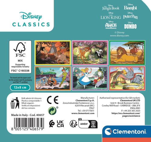 Sada 6 obrázkových kociek od Clementoni s motívom Disney classic. Je možné zostaviť 6 rôznych obrázkov podľa predlohy alebo využiť na klasickú hru s kockami, na stavbu komínov a veží. Ideálne pre stimuláciu pozorovacích schopností, rovnako ako logické a manuálne zručnosti. Kocky sú vyrobené zo 100% recyklovaných a recyklovateľných materiálov. Rozmer balenia: 13x12x4,5 cm. Vek 2+