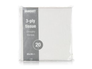 Papierové jedálenské obrúsky s bielym reliéfom 3vrstvové, rozmer 33 x 33 cm. Sú balené v sade 20 ks. Papierové obrúsky sú nevyhnutnou súčasťou nielen pri slávnostnom stolovaní, ale aj pri každodennom použití pri príprave desiat do školy alebo na výlet.