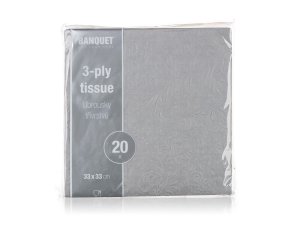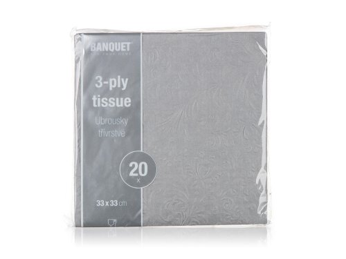 Papierové jedálenské obrúsky so šedým reliéfom 3vrstvové, rozmer 33 x 33 cm. Sú balené v sade 20 ks. Papierové obrúsky sú nevyhnutnou súčasťou nielen pri slávnostnom stolovaní, ale aj pri každodennom použití pri príprave desiat do školy alebo na výlet.