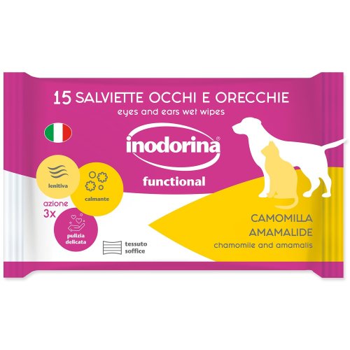 Vlhčené čistiace obrúsky s harmančekom pre zvieratá. Špeciálne určené na čistenie a hygienu očí a uší zvieraťa. Rešpektujú prirodzené pH.