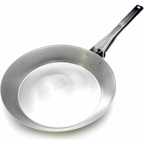 Oceľová panvica s oceľovou rukoväťou na grilovanie a prudké vyprážanie.