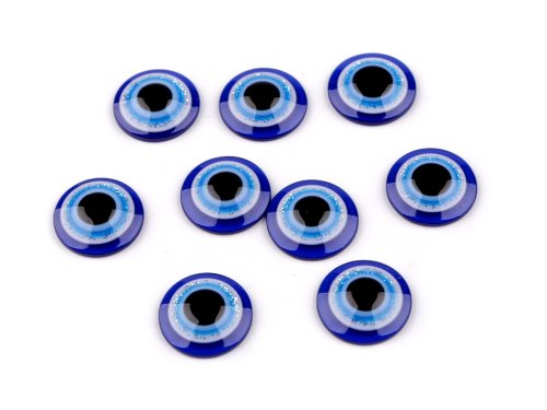 Okrúhle oči s motívom Alahovho oka majú kvalitné spracovanie. Vďaka zaliatym glitrom sa jemne trblietajú. Majú tvar vypuklé šošovky, obrázok oka krásne vynikne. Využijete ich na tvorbu rôznych postavičiek a zvieratiek. Na ich prilepenie je vhodné použiť lepidlo na lepenie kamienkov. S obľubou sa používajú aj na výrobu bižutérie, ako kabošony sú vhodné na nalepenie do kovového lôžka alebo na obšitie korálkami a rokajlom. Veľmi pôsobivé sú v drôtovaných šperkoch.