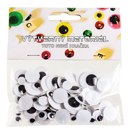 balenie obsahuje 75ks očí s pohyblivou zorničkou oči majú štyri rôzne veľkosti (8, 10, 15 a 20 mm) oko je bielo s čiernou zorničkou