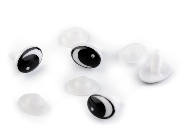 Oválne plastové oči so šibalským výrazom využijete na výrobu rôznych zvieratiek a postavičiek napr. plyšákov. Pre pevné prichytenie majú oči na vrute závity, ktoré sa pevne uchytia v materiáli používanom pri výrobe plyšákov. Z druhej strany sa nacvakne poistka, ktorá oči bezpečne zachytí na miesto. 1 [sada] = 1 očko + 1 poistka Dĺžka skrutky je 1,2 cm. Nevhodné pre deti do 3 rokov.