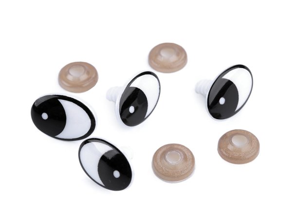 Bezpečnostné plastové oči so štvoráckym výrazom využijete na výrobu rôznych zvieratiek a postavičiek, napr. plyšákov. Pre pevné prichytenie majú oči na vrute závity, ktoré sa pevne uchytia v materiáli používanom pri výrobe plyšákov. Z druhej strany sa nacvakne poistka, ktorá oči bezpečne zachytí na miesto. 1 sada = 1 očko + 1 poistka Dĺžka skrutky je 1,2 cm.