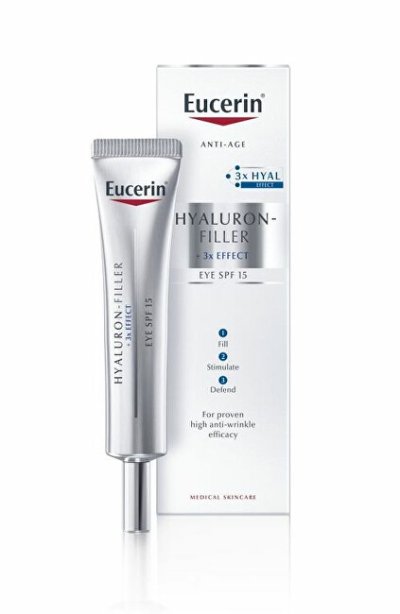 Eucerin Hyaluron-Filler Očný krém SPF 15 bojuje s prvými známkami starnutia pleti, ako sú vejáriky v chúlostivej oblasti okolo očí. Viditeľne vyhladzuje jemné linky aj hlboké vrásky, a poskytuje tak mladší vzhľad pleti. Poskytuje pleti účinnú ochranu proti predčasnému starnutiu spôsobenému UV žiarením a proti prehlbovaniu vrások a zároveň ju chráni pred voľnými radikálmi . Vysokomolekulárna kyselina hyalurónová zlepšuje hydratáciu a vyhladzuje najvrchnejšie vrstvy pleti, zatiaľ čo nízkomolekulárna kyselina hyalurónová, ktorej molekula je 40-krát menšia1, preniká hlbšie do vrstiev epidermis kože, kde vznikajú hlbšie vrásky. Antioxidant glycín saponín podporuje tvorbu vlastnej kyseliny hyalurónovej v dermis vrstve, kde vznikajú tie najhlbšie vrásky, a zároveň chráni pred voľnými radikálmi. Enoxolon chráni pred degradáciou pleti vlastnej kyseliny hyalurónovej. 1 V porovnaní s vysokomolekulárnou kyselinou hyalurónovou, ktorá je tiež súčasťou zloženia.