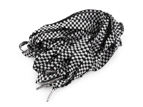 Plochá odevná šnúra je mäkká, krásne poddajná, so vzorom malých kociek. Na oboch stranách má kovovú koncovku s okrúhlym zakončením. Dĺžka koncoviek je 2 cm. Použitie: Šnúra je vhodná do tunelíkov búnd, mikín, teplákov a iných odevov.