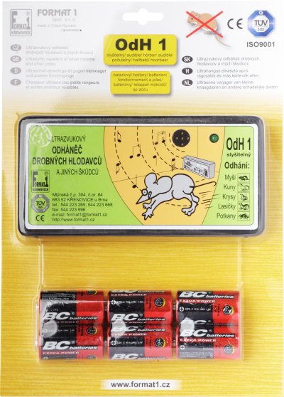 Elektrický, zvukovo-ultrazvukový plašič myší, kún, potkanov, lasičiek a potkanov. Plašič vytvára pre škodcov nepríjemné zvukové prostredie (v oblasti hranice počuteľného zvuku a ultrazvuku), škodcami postupne opustia chránený priestor. Zvuk sa náhodne v čase mení a preto si naň škodcovia nezvyknú. Nevyužíva chemické prísady, neškodí zvieratám. Nie je vhodný do obývaných priestorov. Vhodný do neobývaných, uzavretých priestorov do veľkosti cca 100m2 (pivnice, garáže, chalupy, pôdy ...). Napája sa batériami, ktoré sú súčasťou balenia. Český výrobok s dlhou tradíciou. Rozmery: šírka 185 mm, výška: 88 mm, hĺbka: 31 mm. Hmotnosť bez batérií: 150g.