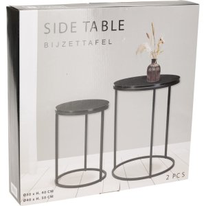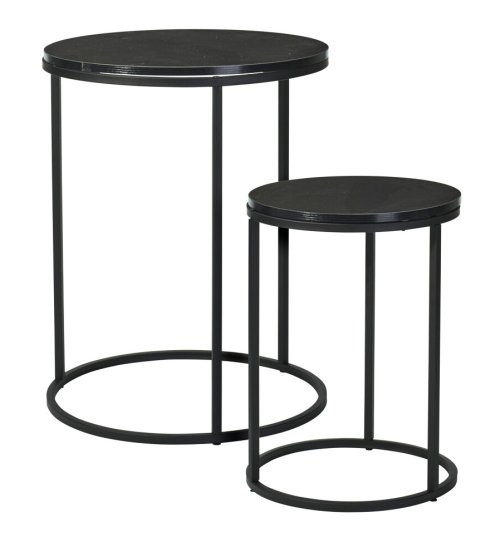 Moderná sada dvoch odkladacích stolíkov v elegantnej čiernej farbe. Kombinuje pevnú železnú konštrukciu s odolnou doskou z MDF. Vďaka dvom rôznym veľkostiam je ideálny ako štýlový doplnok do obývacej izby, spálne alebo kancelárie.