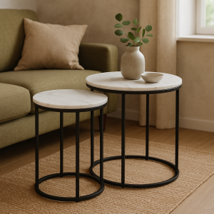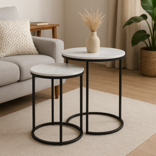 Štýlová sada dvoch odkladacích stolíkov v dizajne matného bieleho mramoru. Kombinácia pevnej železnej konštrukcie a odolnej MDF dosky dodáva interiéru elegantný a moderný vzhľad. Ideálna ako doplnok do obývacej izby, spálne či pracovne.
