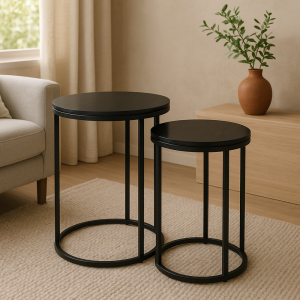 Moderná sada dvoch odkladacích stolíkov v elegantnej čiernej farbe. Kombinuje pevnú železnú konštrukciu s odolnou doskou z MDF. Vďaka dvom rôznym veľkostiam je ideálny ako štýlový doplnok do obývacej izby, spálne alebo kancelárie.