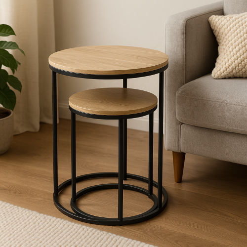 Elegantná sada dvoch odkladacích stolíkov v prírodnej farbe kombinuje pevnú železnú konštrukciu s doskou z MDF. Vďaka minimalistickému dizajnu a dvom veľkostiam sa skvele hodí do moderných aj klasických interiérov.
