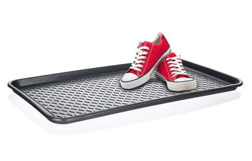 Plastový odkvapkávač na topánky, v čiernej farbe, je vyrobený z recyklovateľného plastu. Odkvapkávač je vhodný pomocník v zimnom období na záchyt vody a nečistôt z obuvi.