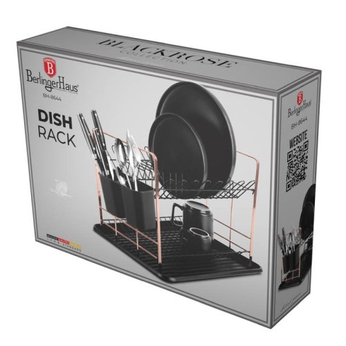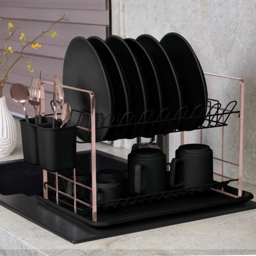Prakticky vybavený odkvapkávač na riad z kolekcie Black Rose Collection <BR>- vyrobený v kombinácii chrómovanej ocele a PP plastu <BR>- celkom 2 poschodia na odkladanie umytého riadu, horný s profiláciou na taniere a spodný rovný <BR>- na strane dve priehradky na príbory a kuchynské náčinie <BR>- dôležitou súčasťou je odkvapkávacia tácka na vodu <BR>- tradičný doplnok do kuchyne navyše v atraktívnom prevedení <BR>- rozmery: priemer 48 x 32 x výška 29 cm <BR>- farba: čierna/ružovo-zlatá <BR>