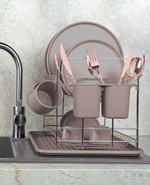 Dvojposchodový odkvapkávač na riad z kolekcie Taupe od BerlingerHaus. Odnímateľná odkvapkávacia tácka. Dve poschodia pre riad či poháre a dva zásobníky na príbory a náčinie. Jednoduchá údržba a čistenie. Dizajnový kúsok vyrobený v kombinácii plastu a kovu. Rozmery 48 x 32 x 29 cm