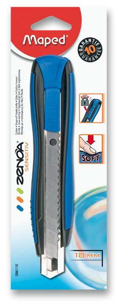 Pevný a odolný odlamovací nôž Maped Zenoa Sensitiv, brit o šírke 18 mm, uložený v kovovom puzdre. Mäkká zóna na pohodlné držanie. Integrovaná poistka. Záruka 10 rokov.