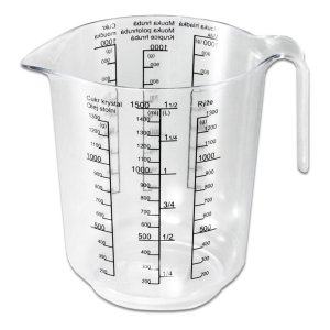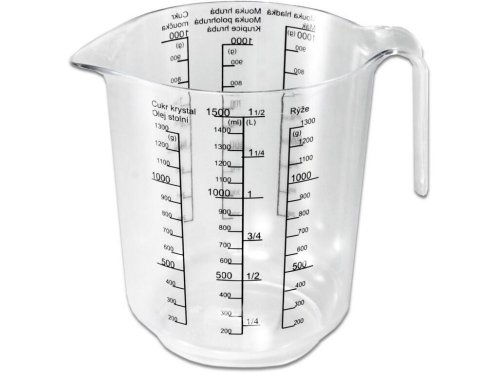 Táto plastová odmerka má merný objem až 1500 ml. Rozmer odmerky: priemer 13cm a výška 16 cm. Je opatrená stupnicou na múku hrubú, polohrubú a hladkú, ryžu, cukor múčku, cukor kryštál, mak, olej a vodu. Český výrobca. EAN 8590474908701