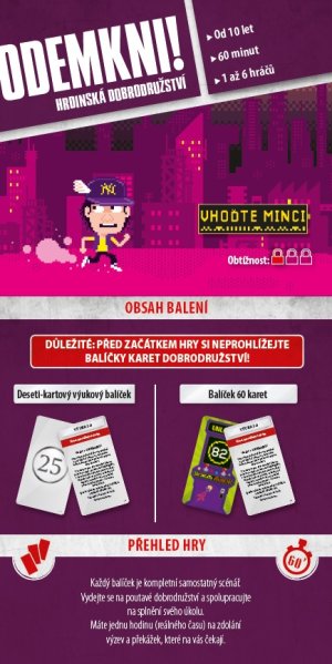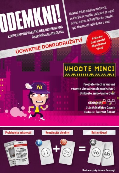Vhoďte mincu Prejdite všetky úrovne v tomto virtuálnom dobrodružstve. Uniknite, alebo Game Over! Prehľadajte miestnosti! Kombinujte objekty! Riešte rébusy! Únikové miestnosti sú miestnosti, z ktorých sa snažíte uniknúť za menej ako 60 minút. ODOMKNI! vám umožní tieto skúsenosti zažiť doma pri stole. Obtiažnosť tejto hry je 1/3.