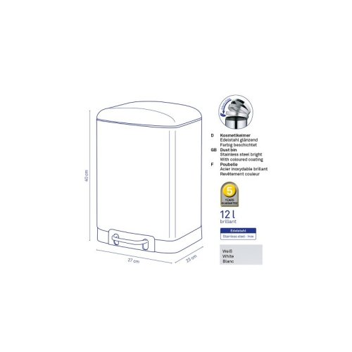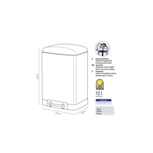 Elegantný, praktický a hygienický – odpadkový kôš DAVINO v bielom prevedení je ideálnym doplnkom pre každú domácnosť, kanceláriu alebo kúpeľňu. Vďaka pedálovému otváraniu a tichému samodovieraciemu systému zaistí maximálne pohodlie pri používaní. Vyberateľná vnútorná nádoba umožňuje ľahké čistenie a manipuláciu s odpadom.