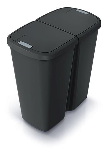 Odpadkový kôš Prosperplast COMPACTA Q DUO sa skladá z jednej veľkej vnútornej nádoby. Napriek tomu vám uľahčí triedenie odpadu u vás doma aj v kancelárii. Je totiž vybavený dvojitým vekom s tlačidlovým otváraním , na ktoré môžete uchytiť jeden alebo rovno dva odpadkové vrecia . Do jedného z nich vyhadzujete napríklad zmiešaný odpad, do druhého plast alebo napríklad papier.