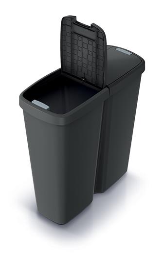 Odpadkový kôš o objeme 50 l, jedna veľká vnútorná nádoba, dvojité veko s tlačidlovým otváraním, možnosť uchytenia 2 odpadkových vriec pre ľahké triedenie.