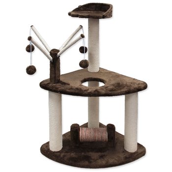 Odpočívadlo s plyšovým poťahom, škrabadlom, plochami na odpočinok a hračkou.