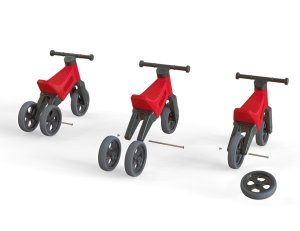 Odrážadlo kúpite zostavené ako trojkolesové. Súčasťou balenia sú dva imbusy a kratšia os na zadné koleso na úpravu odrážadla na dvojkolesové. Je možné zakúpiť aj náhradné diely – samostatné kolesá a osi.