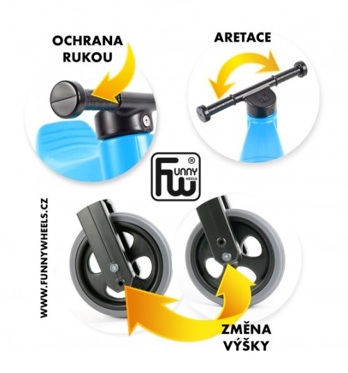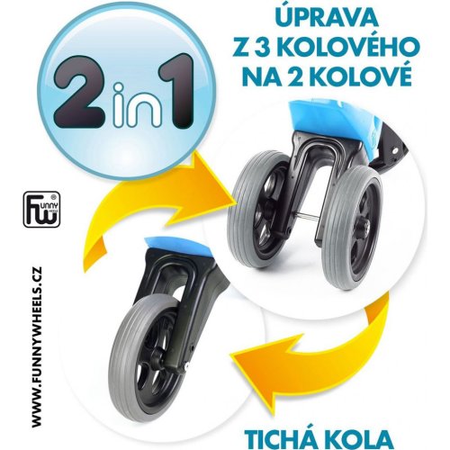A jedééém! FUNNY WHEELS je originálne české odrážadlo, ktoré dokáže rásť s vašim dieťaťom. Vzhľadom na to, že môžete vymeniť dve zadné kolesá za jedno a nastaviť jeho výšku, nemusíte kupovať každý rok nové odrážadlo. FUNNY WHEELS vám vydrží, pokiaľ nebudete kupovať prvé kolo. Hlavné výhody FUNNY WHEELS: 2v1 – behom pár minút zmeníte trojkolesové odrážadlo na dvojkolesové 2 výškové polohy – nastavíte vpredu aj vzadu (rozdiel 3 cm) Tiché pneumatiky, ktoré nešmýkajú na výber v 6 farbách – zelená, červená, modrá, ružová, oranžová, šedá cool design bezpečné aj pre tých spoji umývateľné vlažnou vodou a mydlovými čistiacimi prostriedkami kompletne vyrobené v Českej republike FUNNY WHEELS rastie rovnako, ako váš drobček. Ten začne jazdiť na malom trojkolesovom odrážadle, až sa vytiahne, jednoducho FUNNY WHEELS zdvihnete o 3 cm vyššie a ide sa ďalej. Až príde čas trénovať balans, jednoducho vymeníte dve zadné kolieska za jedno a dieťa sa môže začať pripravovať na jazdu na bicykli. Ako presne to funguje, vidíte na videu. Odstrkovadlo je pritom stabilné (vo variante s tromi kolesami). Vidlica má obmedzený rozsah otáčania a riadidlá sa tak nemôžu pretočiť. Rukoväte riadidiel sú na konci rozšírené, a tým chránia detské ruky pred poranením.