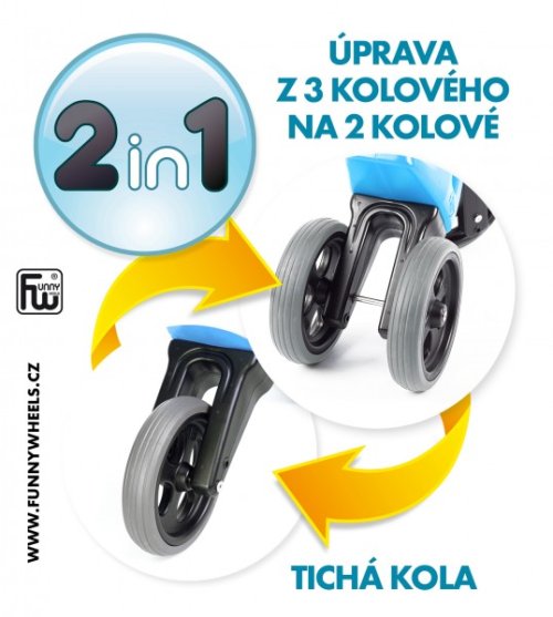 A jedééém! FUNNY WHEELS je originálne české odrážadlo, ktoré dokáže rásť s vašim dieťaťom. Vzhľadom na to, že môžete vymeniť dve zadné kolesá za jedno a nastaviť jeho výšku, nemusíte kupovať každý rok nové odrážadlo. FUNNY WHEELS vám vydrží, pokiaľ nebudete kupovať prvé kolo. Hlavné výhody FUNNY WHEELS: 2v1 – behom pár minút zmeníte trojkolesové odrážadlo na dvojkolesové 2 výškové polohy – nastavíte vpredu aj vzadu (rozdiel 3 cm) Tiché pneumatiky, ktoré nešmýkajú na výber v 6 farbách – zelená, červená, modrá, ružová, oranžová, šedá cool design bezpečné aj pre tých spoji umývateľné vlažnou vodou a mydlovými čistiacimi prostriedkami kompletne vyrobené v Českej republike FUNNY WHEELS rastie rovnako, ako váš drobček. Ten začne jazdiť na malom trojkolesovom odrážadle, až sa vytiahne, jednoducho FUNNY WHEELS zdvihnete o 3 cm vyššie a ide sa ďalej. Až príde čas trénovať balans, jednoducho vymeníte dve zadné kolieska za jedno a dieťa sa môže začať pripravovať na jazdu na bicykli. Ako presne to funguje, vidíte na videu. Odstrkovadlo je pritom stabilné (vo variante s tromi kolesami). Vidlica má obmedzený rozsah otáčania a riadidlá sa tak nemôžu pretočiť. Rukoväte riadidiel sú na konci rozšírené, a tým chránia detské ruky pred poranením.