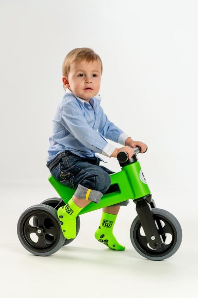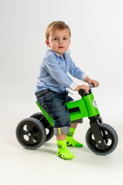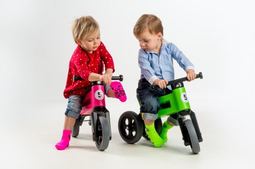 A jedééém! FUNNY WHEELS je originálne české odrážadlo, ktoré dokáže rásť s vašim dieťaťom. Vzhľadom na to, že môžete vymeniť dve zadné kolesá za jedno a nastaviť jeho výšku, nemusíte kupovať každý rok nové odrážadlo. FUNNY WHEELS vám vydrží, pokiaľ nebudete kupovať prvé kolo. Hlavné výhody FUNNY WHEELS: 2v1 – behom pár minút zmeníte trojkolesové odrážadlo na dvojkolesové 2 výškové polohy – nastavíte vpredu aj vzadu (rozdiel 3 cm) Tiché pneumatiky, ktoré nešmýkajú na výber v 6 farbách – zelená, červená, modrá, ružová, oranžová, šedá cool design bezpečné aj pre tých spoji umývateľné vlažnou vodou a mydlovými čistiacimi prostriedkami kompletne vyrobené v Českej republike FUNNY WHEELS rastie rovnako, ako váš drobček. Ten začne jazdiť na malom trojkolesovom odrážadle, až sa vytiahne, jednoducho FUNNY WHEELS zdvihnete o 3 cm vyššie a ide sa ďalej. Až príde čas trénovať balans, jednoducho vymeníte dve zadné kolieska za jedno a dieťa sa môže začať pripravovať na jazdu na bicykli. Ako presne to funguje, vidíte na videu. Odstrkovadlo je pritom stabilné (vo variante s tromi kolesami). Vidlica má obmedzený rozsah otáčania a riadidlá sa tak nemôžu pretočiť. Rukoväte riadidiel sú na konci rozšírené, a tým chránia detské ruky pred poranením.