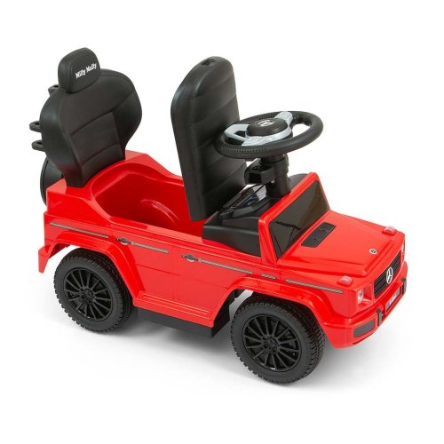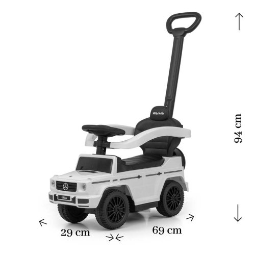 Detské odrážadlo s vodiacou tyčou MERCEDES G350d je vyrobené v licencii koncernu MERCEDES. Váš malý pretekár či pretekárka sa v ňom bude cítiť ako v naozajstnom džípe. Odrážadlo je vyrobené s dôrazom na každý detail a kvalitu použitých materiálov. Jeho vzhľad upúta pozornosť nielen každého dieťaťa, ale aj rodičov. Odrážadlo pomáha rozvíjať motorické schopnosti dieťaťa a Váš malý pretekár či pretekárka si s ním užije množstvo zábavy a zábavy. Autíčko má na trojramennom volante tlačidlá vydávajúce rôzne melódie, zvuk motora alebo húkačku. Je určené ako pre najmenšie deti, ktoré už vedia sedieť, tak aj pre deti, ktoré sa už naučili chodiť. Odrážadlo má otočné predné kolesá, široké a komfortné sedadlo s úložným priestorom a pohodlnú a zároveň pevnú vodiacu tyč, ktorú je možné odrážadlo riadiť. Vodiacu tyč, opierky na ruky a podnožky je možné zložiť a tým dieťa využije autíčko ako klasické odrážadlo. Batérie nie sú súčasťou balenia (2x AA 1.5V).