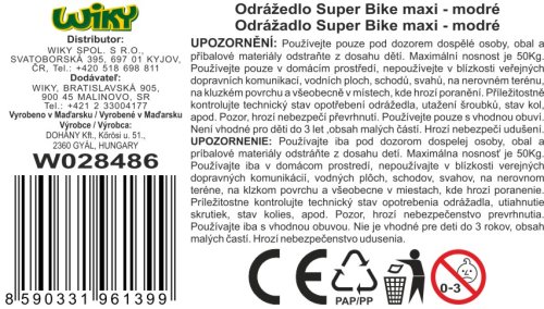 Odrážadlo Super Bike maxi. Modrá farba. Dĺžka 60 cm, šírka 28cm, výška 48cm. 3 kolá. Max nosnosť 50 Kg.