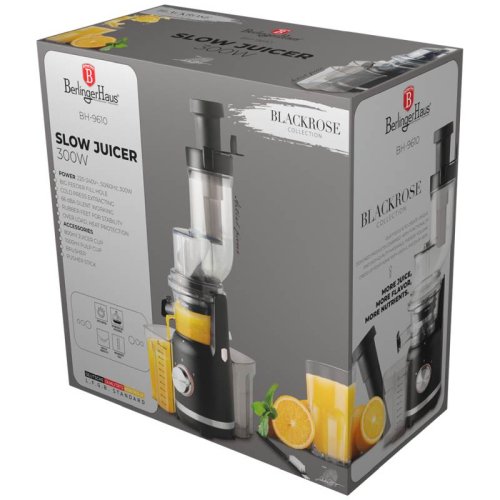 Objavte eleganciu a praktickosť s pomalým odšťavovačom Berlingerhaus BH-9610 z kolekcie Black Rose. Tento štýlový a výkonný odšťavovač vám pomôže získať z vášho obľúbeného ovocia každú kvapku! Vďaka technológii pomalého lisovania sa taktiež zachováva vláknina a živiny z plodov, čím vzniká zdravá a na vlákninu bohatá šťava.