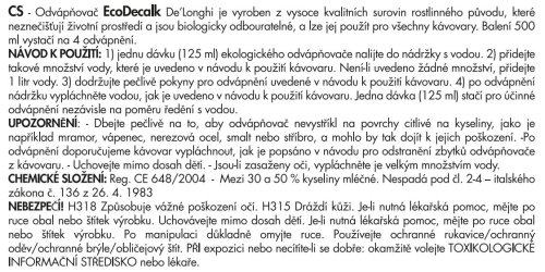 • Pravidelné používanie De´Longhi EcoDecalk zaručuje dlhú životnosť kávovaru a zvyšuje energetickú účinnosť, pretože usadzovanie vodného kameňa v skutočnosti zvyšuje spotrebu elektrickej energie až o 30%.