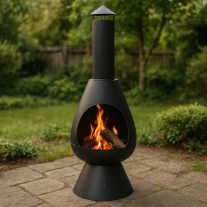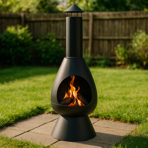 Štýlový komínový krb z ohňovzdorného čierneho kovu je ideálnym doplnkom pre vonkajšie posedenie. Vytvára príjemnú atmosféru, poskytuje teplo a zároveň pôsobí elegantne ako dizajnový prvok záhrady alebo terasy.