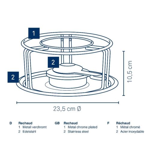 • materiál: chrómovaný kov / nerezová oceľ - sada obsahuje: - 1x chrómovaný stojan - 1x tácka z nerezovej ocele - 1x horák z nerezovej ocele 18/10 - priemer: 23,5 cm - výška: 10,5 cm - značka: KELA