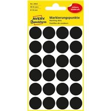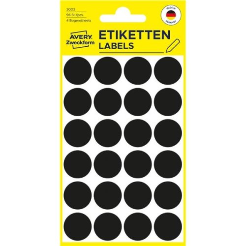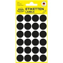 Okrúhle značkovacie etikety čiernej farby Vhodné pre ručný popis Farba: čierna Priemer: 18 mm Počet etikiet na hárku: 24 kusov Počet hárkov: 4 kusy Počet etikiet v balení: 96 kusov