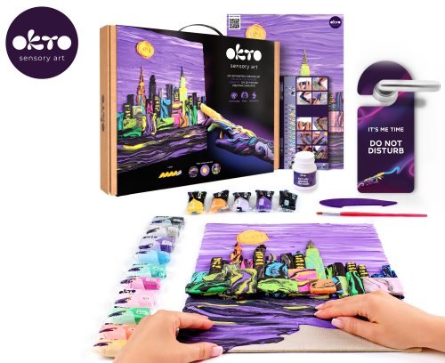 OKTO Maľovanie hmotou motív "#Skyline - New York". Veľkosť plátna 30x40 cm. Obtiažnosť 4/5. Obsah balenia - prírodné plátno, obrázkový návod, modelovací nástroj, súprava samoschnúcej modelovacej hmoty, akrylový lak 20 ml, štetec.