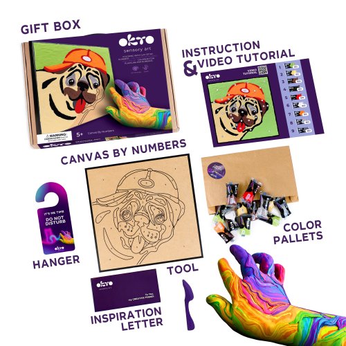 OKTO Maľovanie hmotou podľa čísel "Buldoček" 29x29 cm. Obsah balenia - rám, plátno, obrázkový návod, modelovací nástroj, sada farebných tvarovacích zmesí 14 ks.