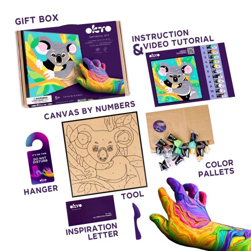 OKTO Maľovanie hmotou podľa čísel "Koala". Veľkosť plátna 29x29 cm. Vytvarujte obrázok podľa čísel. Obsah balenia - plátno, obrázkový návod, modelovací nástroj, sada farebných tvarovacích zmesí 14 ks.