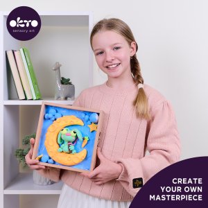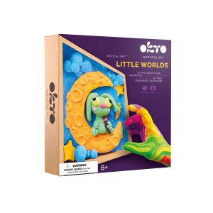 OKTO Modelovanie Malý svet v rámčeku motív "Zajíček na mesiaci". Veľkosť rámu 21x21 cm. Vytvarujte 3D scénu podľa návodu. Obsah balenia - drevený rám, obrázkový návod, drevený modelovací nástroj, sada samoschnúcej modelovacej hmoty, akrylový lak 20 ml, štetec.